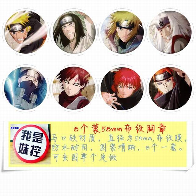 火影忍者 动漫马口铁徽章胸章圆形布纹胸针 8款一套 58MM