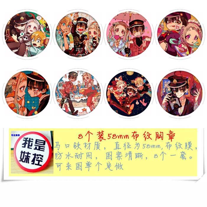 商品名称: 地缚少年花子君 8款一套圆形布纹胸针 胸章挂件 58mm