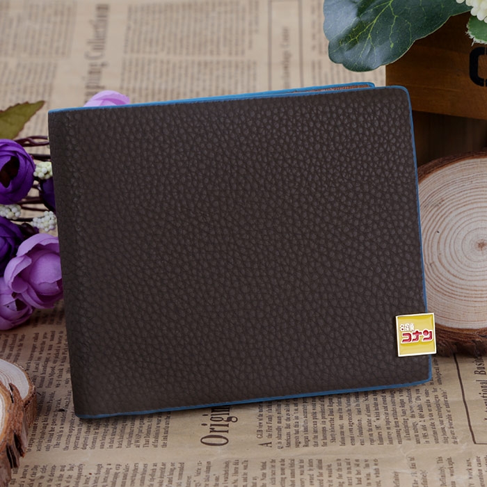 名侦探柯南字母金色小号标志进口PU皮短款棕色底蓝色油边钱包
