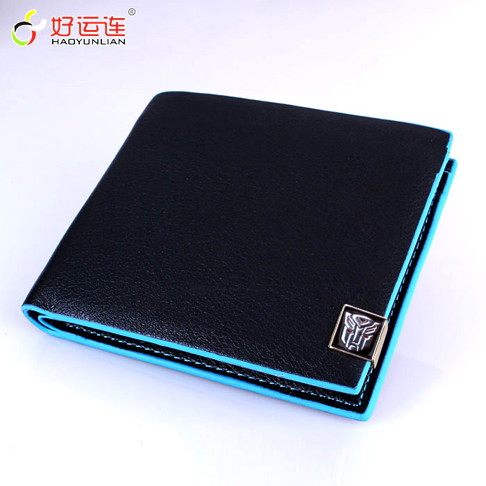 变形金刚博派标志银色进口PU皮短款蓝色油边钱包