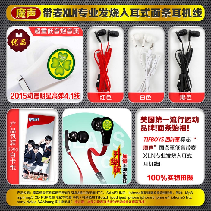 TFBOYS四叶草标志面条重低音带麦耳机不挑款随机出