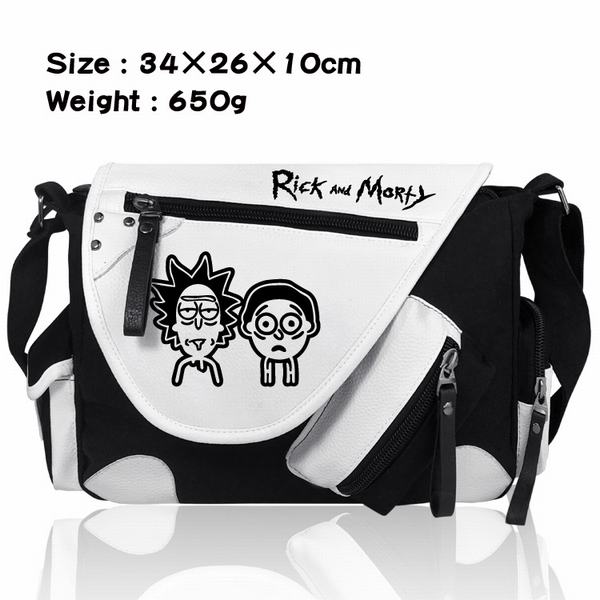 瑞克与莫蒂二人标志加厚PU皮帆布布拼色黑白挎包