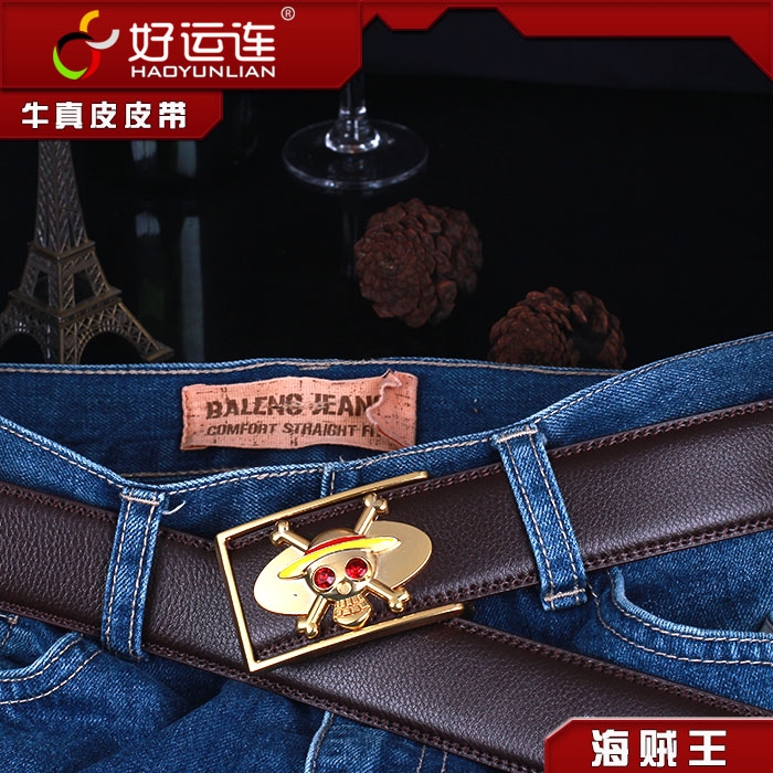 - 海贼王合金扣头金色草帽路飞标志黑色真皮皮带 ¥12.90