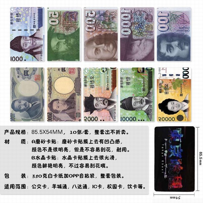 韩日瑞士法郎一套10个装磨砂卡贴5套起批