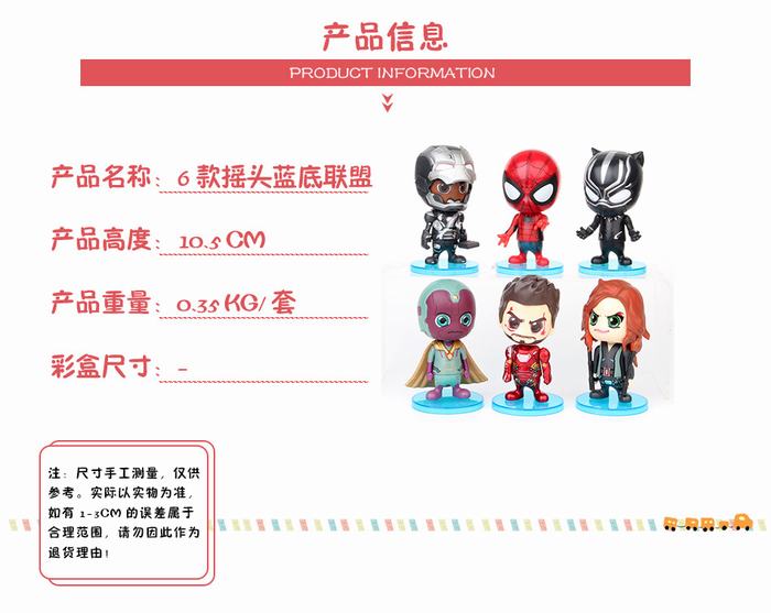 复仇者联盟 6款一套摇头蓝底联盟 袋装手办摆件模型 10.5CM 0.35KGS