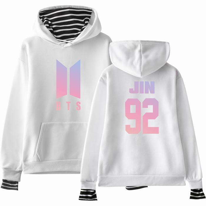 热销bts防弹少年团欧美潮牌假两件连帽卫衣女款批发 白色 JIN92号 2件起批 XXS XS S M L XL XXL