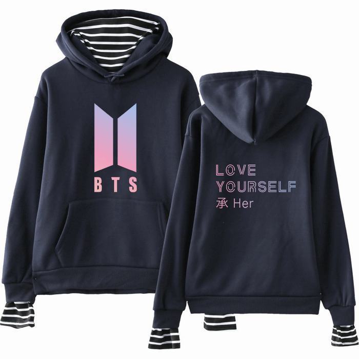 2018新款bts防弹少年团韩版潮牌假两件连帽卫衣女款 藏青蓝色 2件起批 XXS XS S M L XL XXL
